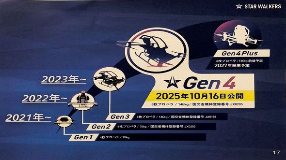 STAR WALKERSはさまざまな段階を踏んで製品化を進めてきた。同製品の基になったドローンとして2021年に発売した建設現場でモノを運ぶ「スカイクレーン」がある。スカイクレーンは4軸のそれぞれが1枚のプロペラを持つ4枚プロペラで駆動し、70kgまでのモノ/人なら運ぶことができるドローンだ。W.S.Pが初めて国土交通省から有人飛行の許可を取得した機体である。ここから同社はさらなる製品開発に力を入れていき、2023年にSTAR WALKERSの前身と呼べる8枚プロペラで駆動するドローンが誕生し、今回の新製品の発表につながった。