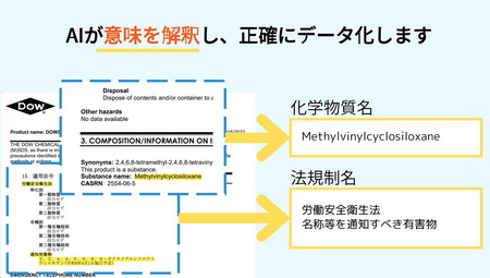 製品品質情報管理の課題解決・管理業務向けSaaS「ケミカン」は、曖昧で複雑な化学物質管理やリスクアセスメントをAIで効率化するクラウドサービスだ。現場担当者がSDSなどの関連ドキュメントをシステムにアップロードするだけで、AIと専門スタッフがその内容を解析・データ化し、一元管理を可能にするというものだ。