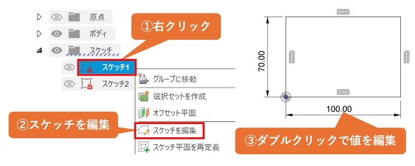 履歴に保存されたスケッチをダブルクリック、または右クリックしてショートカットメニューから編集モードに入り、定義した寸法値をダブルクリックして値を変更します。