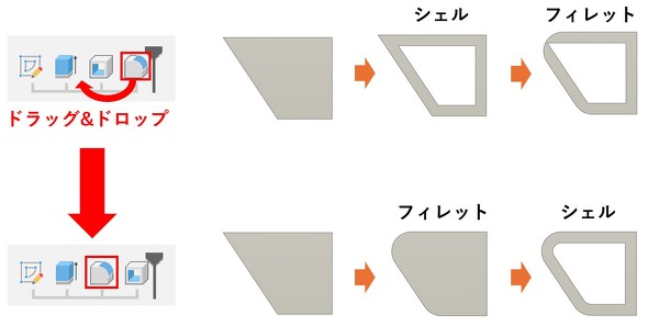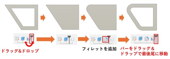 作業履歴に保存されたフィーチャーの順番は、ドラッグ&ドロップやメニュー操作によって並べ替えが可能です。