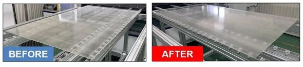 分離したガラスの表面に残るEVA樹脂を、EVAスクレーパーの特殊なブラシで除去する。電気と圧空エアーのみで稼働するシンプル設計で、1枚当たり約60秒の高速処理が可能だ。除去したEVAは、集じん機構で回収する。ガラスを割らずに不純物を低減し、水平リサイクルの価値向上に寄与する。
