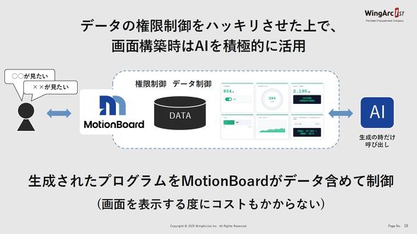 この問題を解決するために、新しいMotionBoardではユーザーの見たい情報に応じたダッシュボードを生成する時だけ、AIを活用する仕様としている。与えるデータや情報へのアクセス管理はMotionBoard上で厳密に行う。生成されたプログラムの中でデータ部分だけをMotionBoardで差し替えることができる。これにより、画面を表示するたびにAIを呼び出す必要もなくなり、データが瞬時に表示されて生成コストも掛からなくなる。