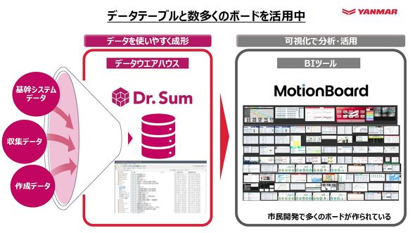 ヤンマー建機では、社内に存在する多様な情報をウイングアーク1stが展開する「Dr.Sum」に入れて管理するという方針の下、データの可視化と活用をユーザーが主体的に開発できるように進めている。PCを持つほとんどの社員(500人以上)にMotionBoardの権限を与えている。また、同社内のDX(デジタルトランスフォーメーション)専門部隊がDr.Sumに格納されたデータのテーブルや見え方を整備しており、現在では1800個のデータテーブルが生まれ、1500個にも及ぶダッシュボードが作成されているという。「『どんどんみんなで作ろう』と社内でAI活用を促した結果、これだけのデータ活用の仕組みが生まれた。その内の7割は活用できていないが、私はそれでいいと思っている」(田中氏)。