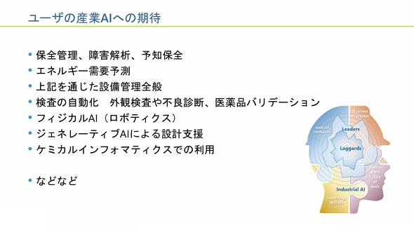 ユーザー企業は、保全管理、障害解析、予知保全、エネルギー需要予測、これらを通じた設備管理全般、検査の自動化、外観検査、不良診断、医薬品バリデーション、フィジカルAI(ロボティクス)、ケミカルインフォマティクスの効率化の実現で、産業用AIに期待しているという。「生成AIは設計支援で有望視されている」(伊東氏)。