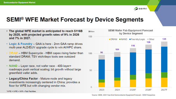 半導体前工程装置市場をセグメント別に見ると、ロジックファウンドリーでは今後2年間は力強い伸びを示すと見る。「2nmのゲートオールアラウンド(GAA)など最先端デバイスの生産が増えていくためだ」。DRAMはHBMへの設備投資によって、15%前後の成長が続くと見る。NANDも成長を続けるが、「生産能力の拡大ではなく、次世代技術への移行が主な投資要因となる」。