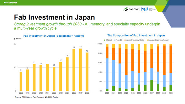 日本においては、装置や工場を含めたファブ投資が2026年から拡大し、2029年には180億ドルに上ると予想する。ロジック関連投資の割合が高まる一方で、アナログ/パワー半導体への投資は減少を見込む。「パワー半導体における中国との競争および300mmウエハーへの移行が要因となる」。