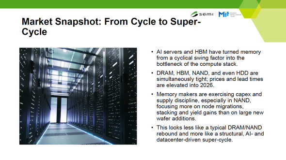 AIデータセンターの建設が相次ぐ一方で、メモリ不足が指摘されている。「AIサーバはHBMもたくさん使用する。そうすると標準的なDRAMにまで生産キャパシティーが回らなくなってしまう。2025年はDRAMだけでなく、HBM、NAND、HDDまで供給が逼迫している。この状況は2026年まで続くと見ている。AI需要の力強さを鑑みると、メモリ全体として“スーパーサイクル”に入ってきており、この状況は2030年ごろまで衰えることはないというのが現在の見通しだ」。