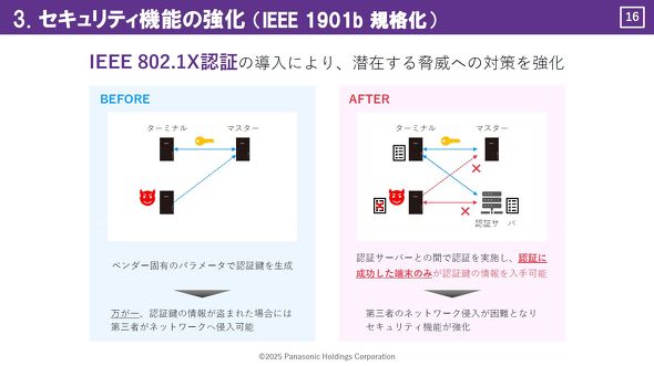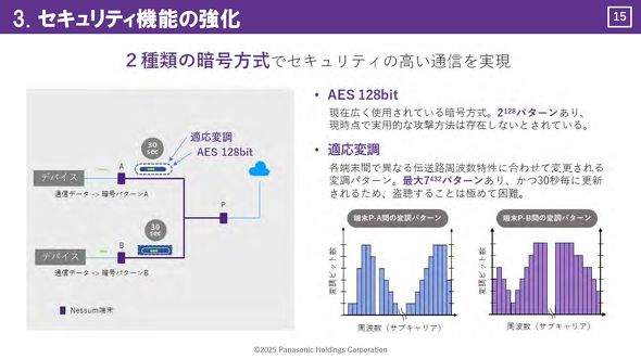 パナソニックHD 技術部門 事業開発室 Nessum部 事業創生課 シニアエンジニアの川畑直弘氏は「NessumがイーサネットやWi-Fiといった他の通信方式と競合するのではなく、これらの通信方式がカバーしきれない部分を“ピースを埋める”形で、顧客のネットワーク最適化を実現していきたい」と述べる。ピースを埋める技術として、Nessumは大きく分けて「マルチホップ技術」「フレキシブルチャネル技術」「セキュリティ機能の強化」の3点で進化を続けている。