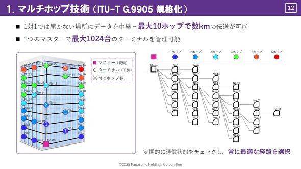 マルチホップ技術は国際標準規格であるITU-T G.9905で規格化されている、1対1では届かない場所にデータを自動で中継する技術である。この技術を活用することで、最大10ホップで数kmの伝送が可能となり、1つの親機で最大1024台の子機を管理できる。これにより、大規模なビルや工場でもネットワーク構築が可能だ。