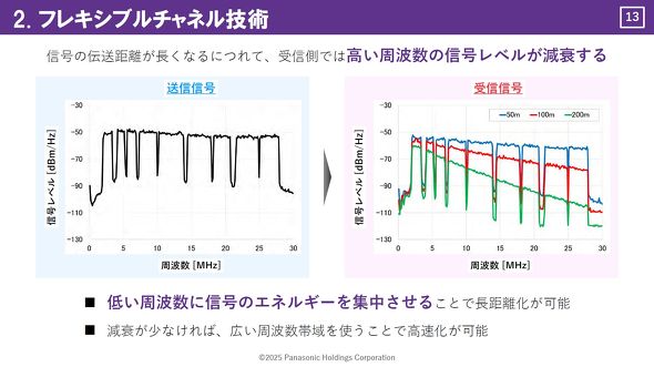また、送信したデータ信号の伝送路が長くなるにつれて、受信側では高周波数側の信号レベルが減衰してしまう課題に対しては、フレキシブルチャネル技術を活用。低い周波数に信号のエネルギーを集中させることで、長距離での伝送を可能としている。