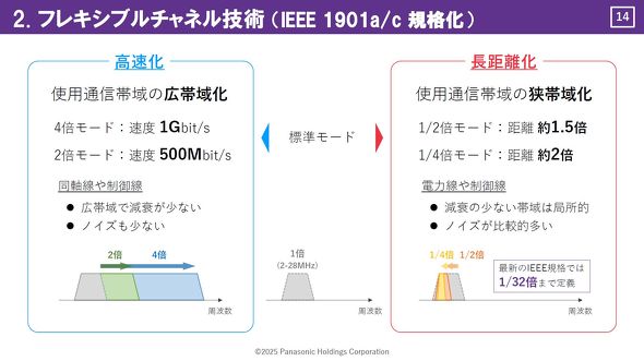 川畑氏は「Nessumでは標準モードの2M〜28MHzの信号帯域を2倍、4倍に広げることで500Mbps、1Gbpsといった高速通信が可能になる。また、信号帯域を2分の1、4分の1に狭めることで伝送距離を1.5倍、2倍と伸ばすことができる」と述べる。