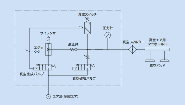 バルブなどを組み込むなどして機能を高めた真空吸着システム:真空生成バルブをON/OFFすることでエジェクタの真空生成を制御できるなど、ロボットシステムと組み合わせやすい機器構成になっている 出所:シュマルツエアー源とエジェクタの間にソレノイドバルブ(吸着制御バルブ)を配置します。これにより、エジェクタ駆動源である工場エアーを間欠させることができるようになります。