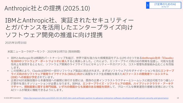 実際にIBMは2025年10月に、Anthropicと業務提携を発表。同社の強力なLLM(大規模言語モデル)の1つである「Claude」をIBMのソフトウェア/ポートフォリオに導入して、エンタープライズ向けのAI開発を加速している。IBMのソフトウェア開発部門内でもAI駆動開発を2025年から実施しており、生産性が改善した事例も次々と出てきている。