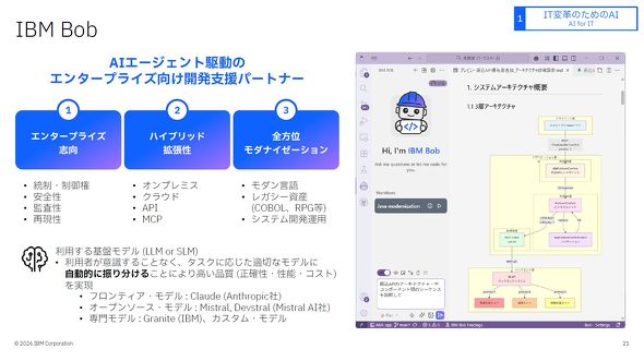 日本IBMは、エンタープライズ向けのAI駆動開発を支援する「IBM Bob」を中心に仕様駆動開発を推進すると発表し、同社が掲げるAI戦略について説明した。