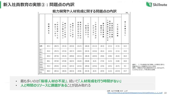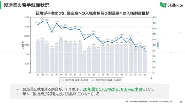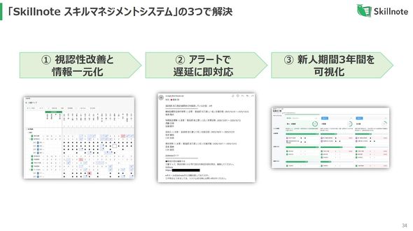 近年ではこの問題を解決するために、デジタル/AI(人工知能)ソリューションなどを活用する企業が増えている。VR(仮想現実)機材を活用した労災体験や熟練作業が持つノウハウや技術文書に記載されている内容をAIに学習させて最適化し、そのデータを新人教育に活用するといったツールも登場している。スキルノートでは技術スキルの可視化を通じて人材育成の支援に取り組んでいる。