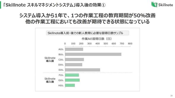 これらの機能を駆使して改善を進めた結果、同社では1つの作業工程の教育期間を50%短縮させることに成功した。また、管理職や教育担当者が新人の教育状況を把握しやすくなったため、フィードバックをすぐにできるようになった。山川氏は「実際に現場の新人作業者に話を聞くと、『自分が次に何をやって成長できるのかが分かるようになった』という意見や『資格取得やスキルアップのためにやりたいことを自分で考えられるようになった』という反応があった。このことから、個人のモチベーションにつながっていると感じており、これも相まって育成速度の向上に結び付いているのではないかと考えている」と述べている。