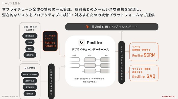 また、大きな地震が発生した際のリスク検知や調査についても、同サービスを導入することで自動化できる。さらに、今後の追加機能として大量のデータを自動でクレンジングして活用できる「Resilire AI Agent」を2026年4月頃にリリースする予定だ。