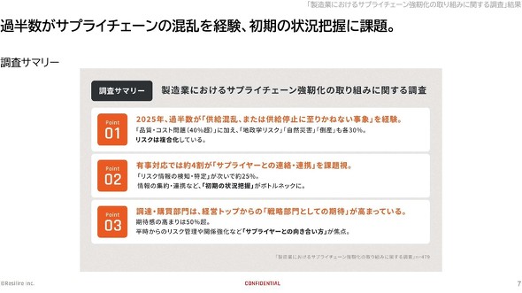 レジリアでは従業員500人以上の製造業における役員や管理職を対象に「製造業におけるサプライチェーン強靭化の取り組みに関する調査」を実施してサプライチェーンにおける課題を調べた。調査の結果、過半数の人がサプライチェーンにおける混乱を経験しており、状況把握に課題を感じていると判明した。