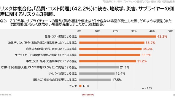 サプライチェーンの混乱要因については、品質/コスト問題が42.2%と一番多く、その次に地政学リスクが35.7%、自然災害が34.2%、サプライヤーの経営状況悪化/倒産リスクが33.5%と続いている。