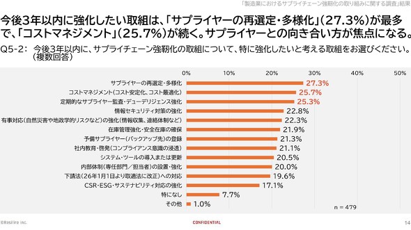 今後3年以内に取り組みたいサプライチェーンの強靭化項目に関する質問では、サプライヤーの再選定/多様化と回答した人が27.3%と一番多く、その次にコストマネジメントが25.7%、定期的なサプライヤー監査/デューデリジェンス強化が25.3%と続いている。