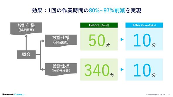 具体的な効果としては従来まで目視確認に50分〜340分かかっていた照合作業を、わずか10分(80〜97%)に短縮可能である。また、作業を標準化することで作業担当者による品質のばらつきも抑制できる。パナソニック コネクト IT・デジタル推進本部 AI&Data プラットフォーム部 データマネジメント課 マネージャーの渡邉勇太氏は「作業時間について、部品図面で50分から10分までの短縮、技術仕様書で340分から10分までの短縮を達成している」と語る。