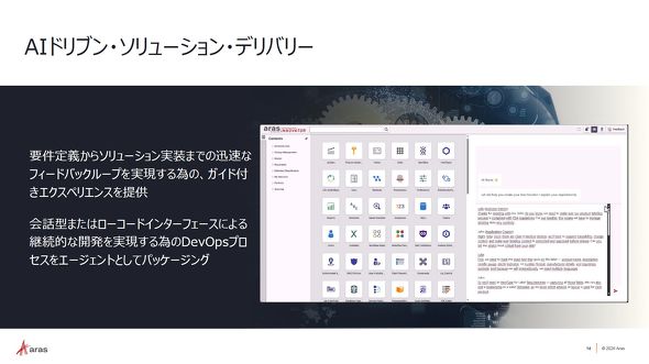 実際にArasは、顧客とのPLM仕様に関するweb会議の様子を録画して、その内容を基にAIが議事録を作成し、この議事録をAras Innovatorの仕様書に使用できる「AIドリブン・ソリューション・デリバリー」機能を開発している。議事録データからAIがさまざまな定義を提案し、その後のAras Innovator用の言語である「AML」に変換して、ソリューション実装まで迅速に進めることができる。自然言語で対話しながらカスタマイズもできるため、システムインテグレーション費用やコンサルティング費用もかからなくなる可能性も秘めている。