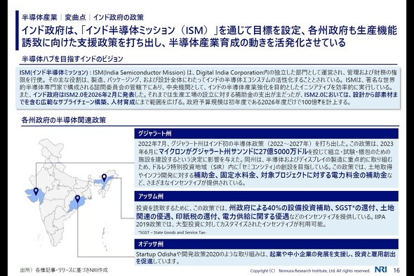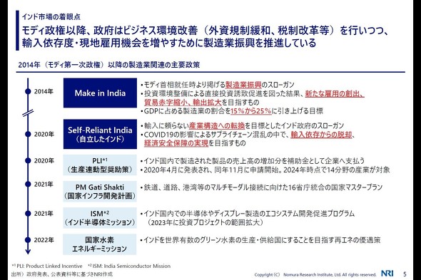インドではモディ政権が成立してから、国内振興として製造業の強化に注力している。インド政府は2014年に、27業種の優先セクターを作成し国内生産のサプライチェーン整備を支援する「Make In India 2.0」という方針を掲げて以降、インド国内の製造業拡大に向けた政策を進めてきた。NRIインド パートナーの郷裕氏は「2027年の国家予算を見てみると、インフラ産業に資本を支出し、ハイテク産業やエッジ産業に注力しようとしている」と分析する。