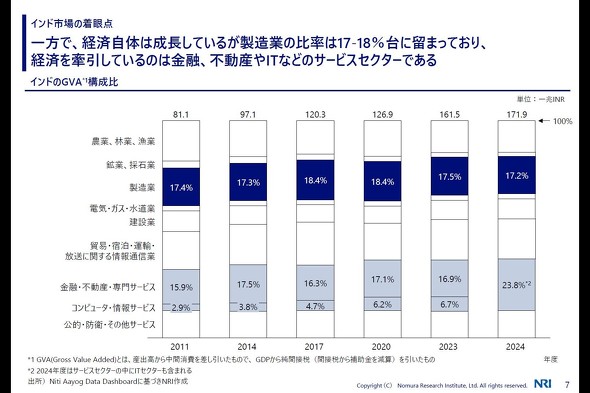 一方、実際にインドのGVA(業界全体の粗付加価値)内訳を見てみると、農林水産業が多くを占めており、製造業の比率に関しては17〜18%あたりで推移し、爆発的には伸びていないのが現状だ。