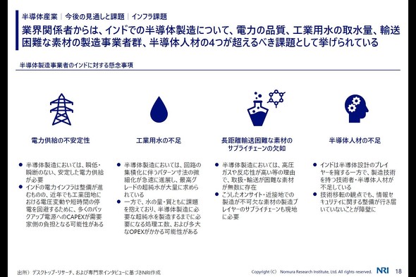 一方、インドはこれまで国内で半導体の量産実績がない。半導体の需要が大きく伸びている中で、インド政府もさまざまな政策を打ち出して、自国の半導体製造能力を強化しようという動きが見られている。NRIインド プリンシパルの石垣悟氏は「インドの半導体業界の課題としては、電力や純水を安定して供給できるのか、インド国内でビジネスをするための商流構築をできるのかという課題がある」と語る。