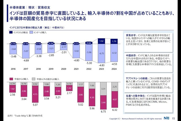 半導体産業に関するインドの輸出入については、現在は圧倒的に輸入の割合が多い状況だ。主要な輸入先は中国で、この依存度をどのように下げていくのかが重要である。