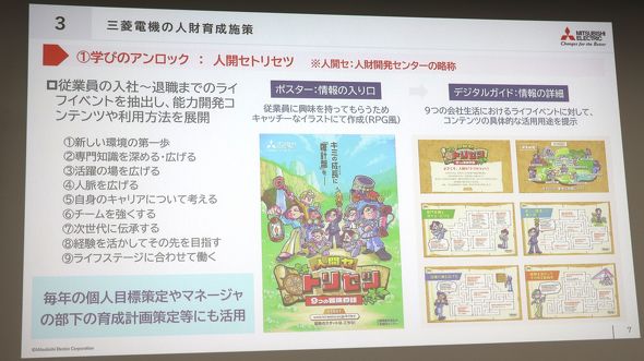 三菱電機の人材育成施策として、入社してから退職するまでのライフイベントを9つに分けて、人事異動や管理職に昇格した場合といった状況を想定した時に、どのようなことを学べばいいのかを確認できる「デジタルガイド」を提供している。従業員に少しでも興味を持ってもらうためにRPG(ロールプレイングゲーム)風のキャッチーなイラストを用意するなどして、情報の入り口を広げているという。西川氏は「ポスターからデジタルガイドに誘導し、最終的に講座の申し込みができるように動線を作っている。よい講座があると従業員が思ったら、そのまま申し込みまでできるような形にすることで、申し込み者の増加を狙っている」と語る。