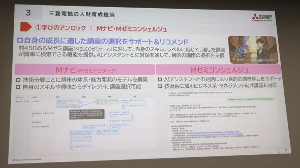 また、三菱電機が提供している450個のMゼミ講座(MELCOゼミナール)の中から、技術分野ごとに効率よく成長できるように必要な講座を見える化する「Mナビ(Mゼミナビゲータ)」や、AIとチャット形式で会話することで自分の目的に合った講座探しをサポートする「Mゼミコンシェルジュ」といったサービスを提供している。