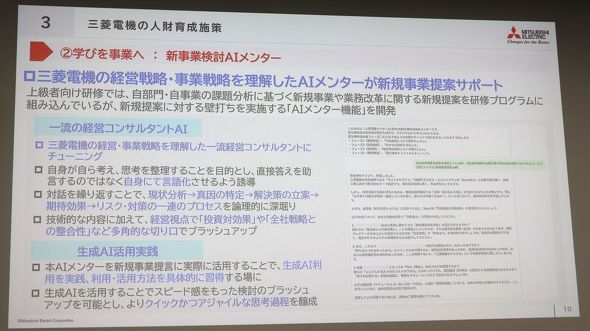 また、上級者向けの研修では、自部門/自事業の課題分析に基づく新規事業/業務改革に関する新規提案を研修プログラムとして実施している。同社は新規提案に対するアイデアの壁打ちを実施する「AIメンター機能」を新たに開発し、今後の研修に導入をしていく。同機能に使用しているAIは、「三菱電機の経営や事業戦略を理解した一流の経営コンサルタント」としてチューニングをしている。同AIは質問に対して、あえて答えを出さないという調整をしているという。