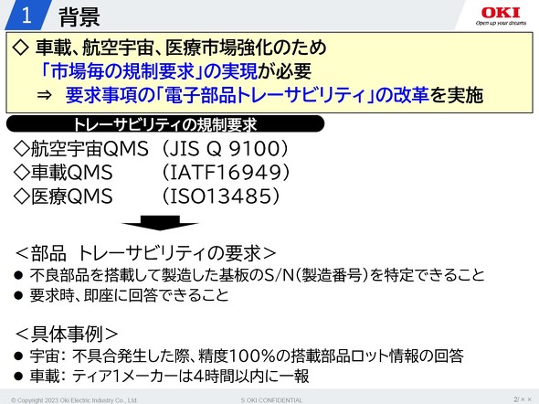 OKIのEMS事業では車載、航空宇宙、医療市場に注力しており、電子部品トレーサビリティーの改革に力を入れている。部品のトレーサビリティーについては、「不良部品を搭載して製造した基板の製造番号(シリアルナンバー、S/N)を特定できる」「要求時、即座に対応できる」の2つを規格内で要求されている。