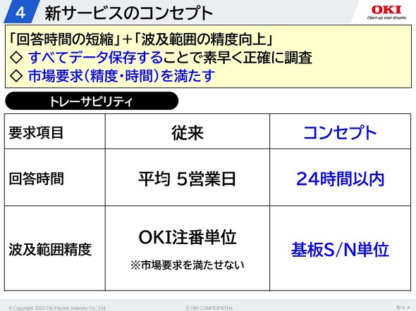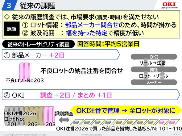 従来の不具合発生時の調査については、OKIに不具合発生に関する調査依頼が来た後に、その内容に関連する部品メーカーに問い合わせをしているが、この部分に2日の期間を要していた。その後、同社はどの基板に不良が発生し、どこに部品を搭載したのかを調査するために2日間、これらの調査結果のまとめに1日という時間がかかっていた。結果的に不具合発生から回答までに平均で5営業日の時間が必要で、多大なコストも発生していた。