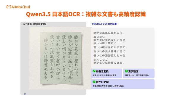 最新版のQwen3.5は日本語のOCR性能が非常に高く、複雑な古い日本語文書も高精度で認識できる。他にも同社はマルチモーダル画像/動画生成モデルの「WAN」やモデル音声認識モデル、テキスト読み上げモデルなどを展開している。