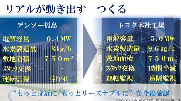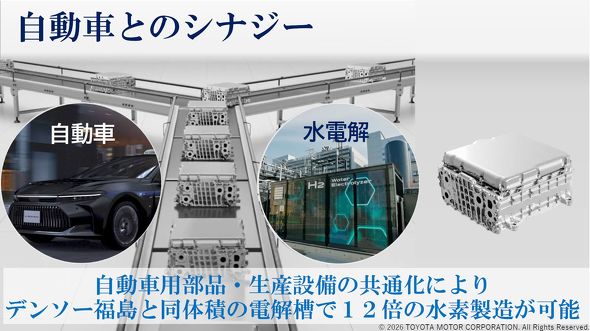 両社は2024年に大規模水電解設備の共同開発および戦略的パートナーシップを発表し、トヨタ自動車本社工場の水素パーク内に水電解設備の導入を進めてきた。協業の原点は2023年3月にスタートした水電解設備についての取り組みだ。トヨタ自動車の「MIRAI」に採用されているFC(燃料電池)スタックなどを流用し、水を電気分解して水素を製造する水電解設備をデンソー福島の工場に設置した。