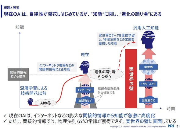 また、汎用人工知能の実現には、AI学習を人依存から脱却する必要があるという。長谷氏は「AIの自己学習は重要なポイントである。実世界は常に変化しており、これに追従する形で、AI自身がこれまで経験した内容から学ぶといった変化が起きないと進化はしていかないだろう」と述べている。