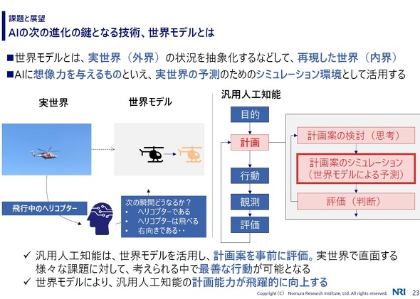 世界モデルは、飛行中のヘリコプターを見た際に、ヘリコプターの向き/状態から次はこの辺りに飛ぶのではないかという人間がするような想像力をAIに与え、実世界を予測するためのシミュレーション環境として活用できる。これにより、汎用人工知能は計画案を事前に評価し、実世界で直面するさまざまな課題に対して最適な行動をとることが可能になる。