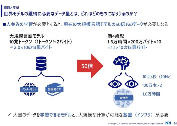 長谷氏は「人間は約4歳で世界モデルが出来上がるといわれている。世界モデルの獲得に必要なデータ量は、現在のLLMと比較して約50倍になると予測されている」と語る。大量のデータを学習できるモデルと大規模計算が可能な基盤整備が、世界モデルの獲得に必要である。