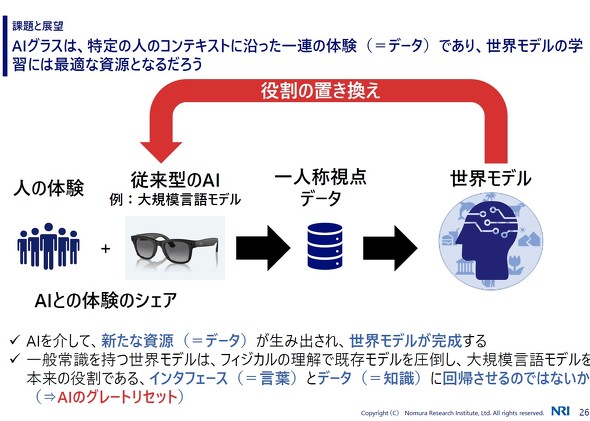 世界モデルを実現するためには、人間の視覚成長のメカニズムを模倣することが効率的だといわれており、AIスマートグラスのようなデバイスから得られる1人称視点のデータによる自己学習手法も考えられている。