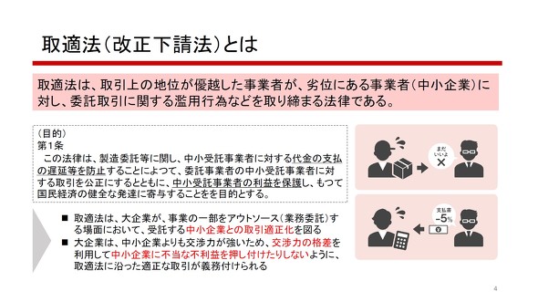 大企業は中小企業と比較すると交渉力が強いことがほとんどであり、この交渉力の格差を利用して中小企業に不当な利益を押し付けないようにするため、取適法にのっとった取引が義務付けられている。阿部・井窪・片山法律事務所 弁護士の松田世理奈氏は「日本企業は非常に中小企業が多い。そのため、大企業が中小企業に対して搾取や乱用行為をしないように制定されている法律である」と語る。
