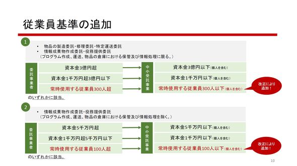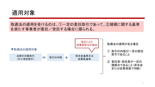1つ目は取適法の適用対象の拡大だ。従業員に関する要件について、取引先の従業員数をどのように把握すればいいのかが分からない企業が多く存在している。委託者の従業員数と受託者の従業員数について確認し、規模の要件を満たすかどうかによって取適法適用の有無が変わる。そのため、取引先の従業員数を正確に把握しなければならないという課題が発生している。