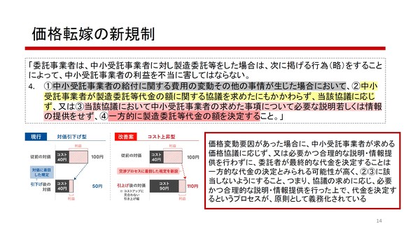 2つ目は価格協議に関する規制強化だ。新しい規制では、業務委託の給付に関する費用の変動が生じた際に、中小受託事業者からその変動に関わる協議を求められた場合、委託側は協議に応じる必要がある。協議に応じた上で、中小受託事業者が求めた項目について、必要な説明や情報を提供して代金などを決めなければならない。「条文上は禁止行為として書いてあるので、裏を返すとこれと逆のことをやってくださいという規制になっている」(松田氏)。