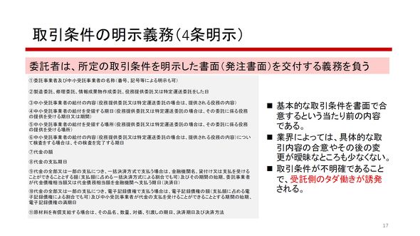 松田氏は「取引条件の明示について、業界によっては具体的な取引内容や根本的に何を委託するかという部分について、口頭で済ましている企業も存在している。根本的な取引条件が不明確になってしまうと、委託のスコープが分からなくなる。そのため、受託側のタダ働きが誘発される可能性がある」と分析する。