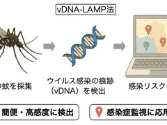 東京慈恵会医科大学は、蚊のウイルス感染の痕跡を検出する「vDNA-LAMP法」を確立した。得られた蚊の検体データからvDNA陽性地点を地図上に表示することで、感染リスク分布を可視化できる。