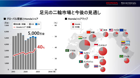 二輪車市場は現状の5000万台規模から、2030年には電動車を含めて6000万台規模に成長すると予測されている。ホンダは競争力の高い商品を継続的に投入するとともに、電動化などカーボンニュートラルへの対応を進めながら、長期的に世界シェア5割を目指す。