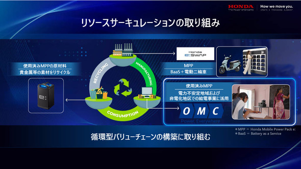 カーボンニュートラルの実現に向けて、バッテリーのリユースやリサイクルなどにも取り組む。インドでは、分散型電源やグリッド事業を展開するOMCパワーと協業し、使用済みのモバイルパワーパックをインドの電力不安定地域や非電化地区での給電装置として活用する。個人商店や学校の給電に役立てる。最終的には、貴金属などの素材のリサイクルを含めた、循環型バリューチェーンの構築も目指す。