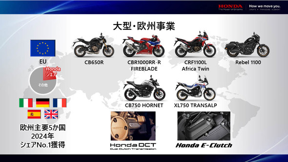 大型車の需要が高い欧州では、「CB」「CBR」「Africa Twin」「Rebel」など好評なシリーズの魅力向上を継続する他、「HORNET」「TRANSALP」など歴史のあるブランドを復活させ、ラインアップを充実させる。ライディング体験を向上させるDCT(デュアルクラッチトランスミッション)や電子制御クラッチなどの技術も拡充している。こうした取り組みにより、イタリア、ドイツ、フランス、スペイン、英国の5カ国では2024年暦年でシェアトップを獲得したという。
