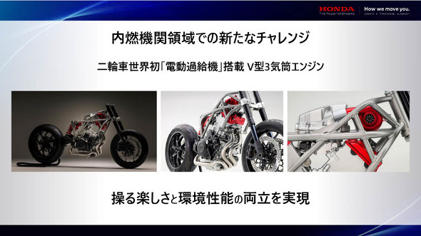 今後は、二輪車としては「世界初」(ホンダ)となる電動過給機搭載のV型3気筒エンジンを新開発し、大型車に適用していく。